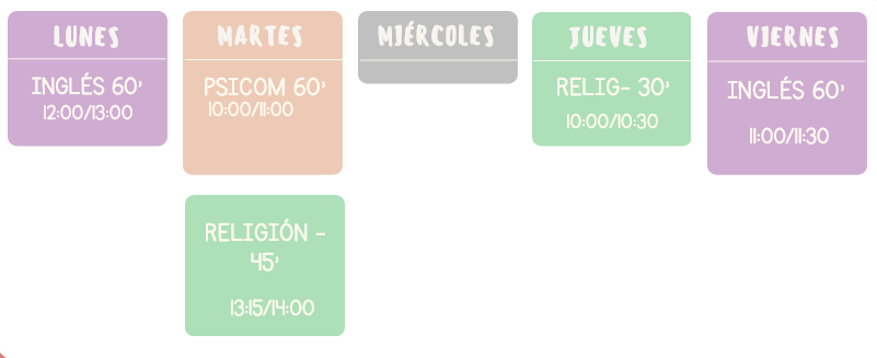 Durante el mes de septiembre, dadas las necesidades del primer nivel de 3 años de educación infantil, nuestros esfuerzos se centran en apoyar a dicho alumnado, el profesorado especialista se centra e estos niveles y no se programan especialidades. A partir de octubre, al tercer nivel de Ed.Infantil le corresponde una hora y media semanal de inglés, una hora de psicomotricidad los martes y sesión y media de religión semanal. El esquema docente queda así: